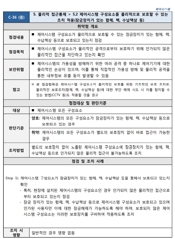 5.2 제어시스템 구성요소를 물리적으로 보호할 수 있는 조치 적용(잠금장치가 있는 함체, 랙, 수납책상 등)