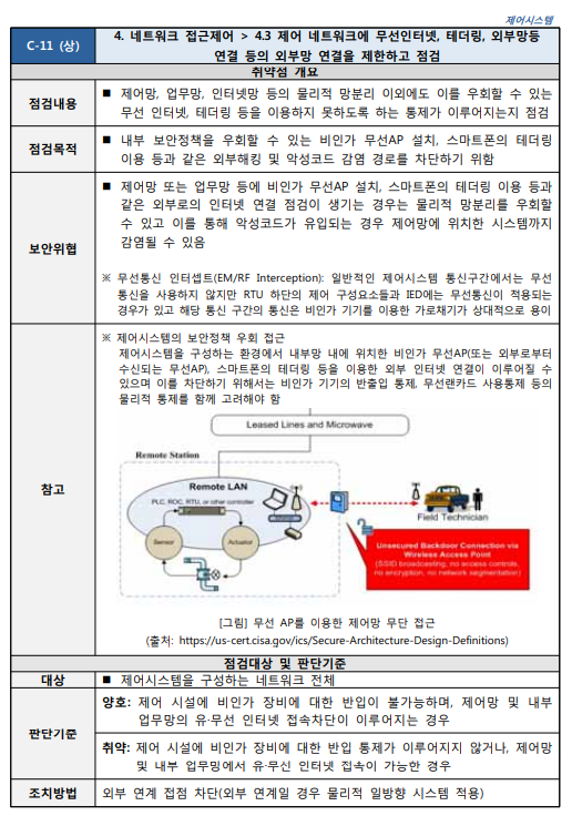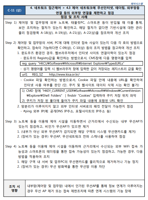 4.3 제어 네트워크에 무선인터넷, 테더링, 외부망등 연결 등의 외부망 연결을 제한하고 점검