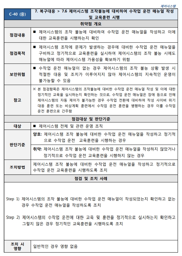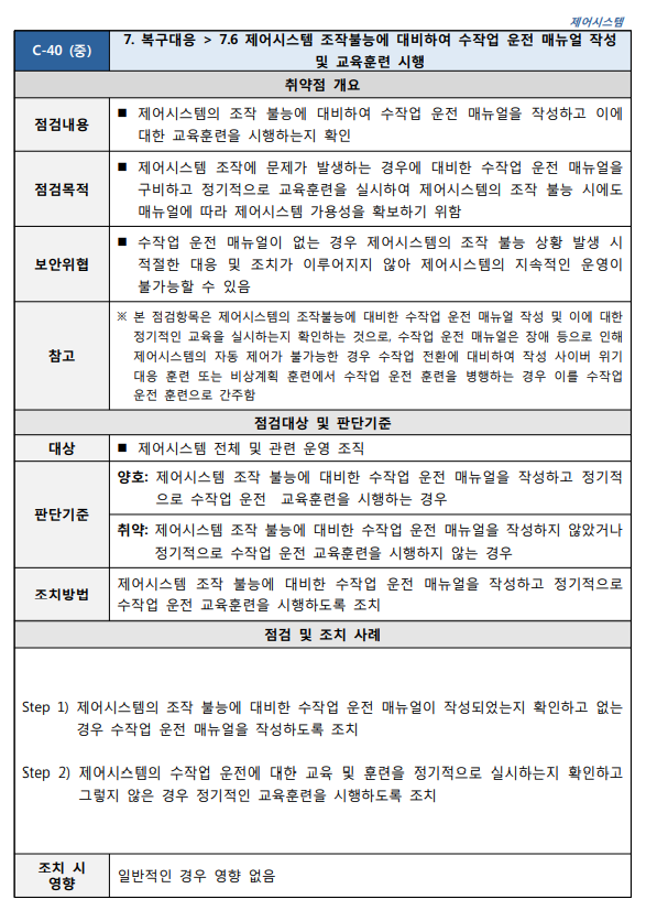 7.6 제어시스템 조작불능에 대비하여 수작업 운전 매뉴얼 작성 및 교육훈련 시행