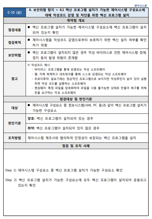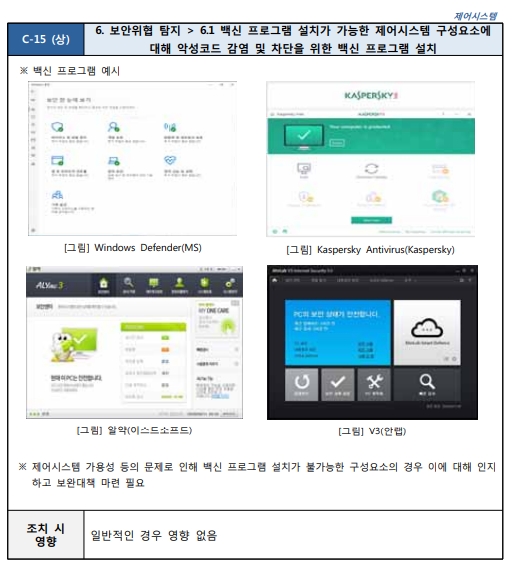 6.1 백신 프로그램 설치가 가능한 제어시스템 구성요소에 대해 악성코드 감염 및 차단을 위한 백신 프로그램 설치