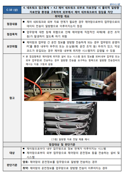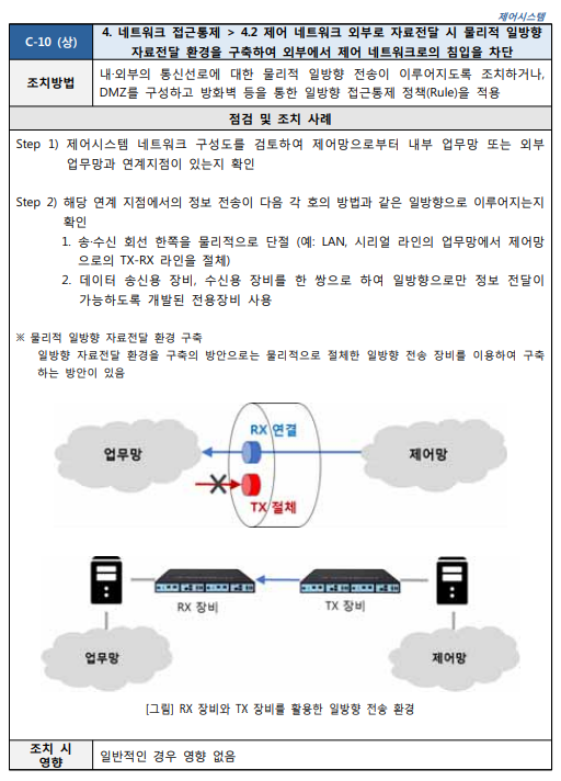 4.2 제어 네트워크 외부로 자료전달 시 물리적 일방향 자료전달 환경을 구축하여 외부에서 제어 네트워크의 침입을 차단