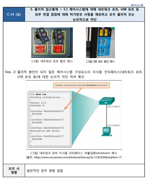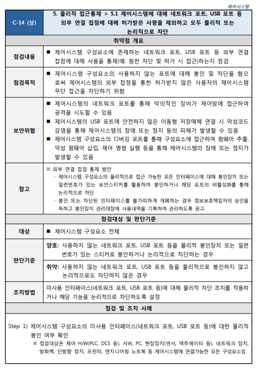 5.1 제어시스템에 대해 네트워크 포트, USB 포트 등 외부 연결 접점에 대해 허가받은 사항을 제외하고 모두 물리적 또는 논리적으로 차단