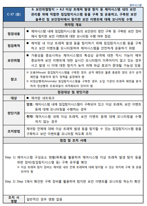 6.2 이상 트래픽 발생 탐지 등 제어시스템 내의 보안 관리를 위해 적합한 침입탐지시스템 등을 구축 및 운용하고, 구축된 보안 솔루션 및 보안장비에서 탐지한 보안 이벤트에 대해 모니터링 수행
