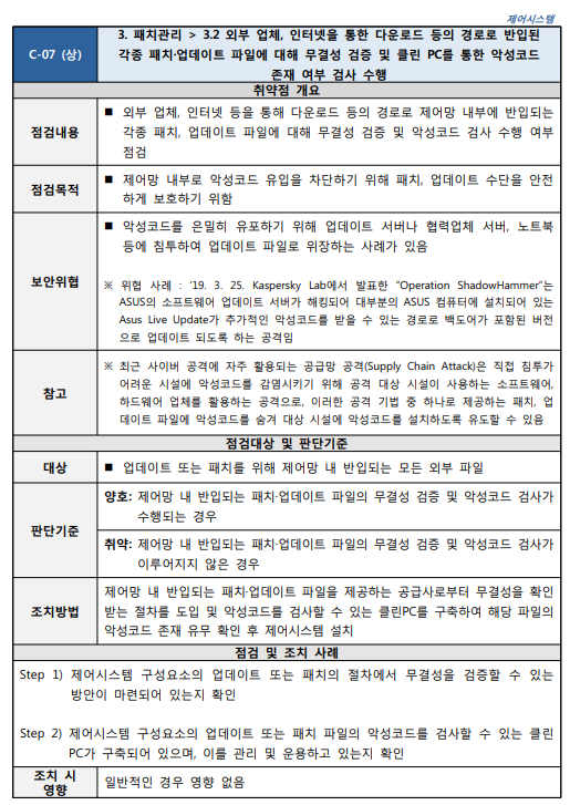 3.2 외부 업체, 인터넷을 통한 다운로드 등의 경로로 반입된 각종 패치 업데이트 파일에 대해 무결성 검증 및 클린 PC를 통한 악성코드 존재 여부 검사 수행