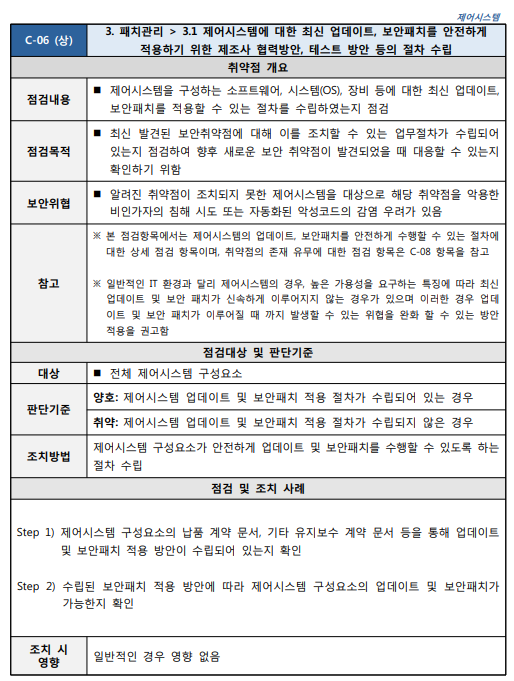 3.1 제어시스템에 대한 최신 업데이트, 보안패치를 안전하게 적용하기 위한 제조사 협력방안, 테스트 방안 등의 절차 수립