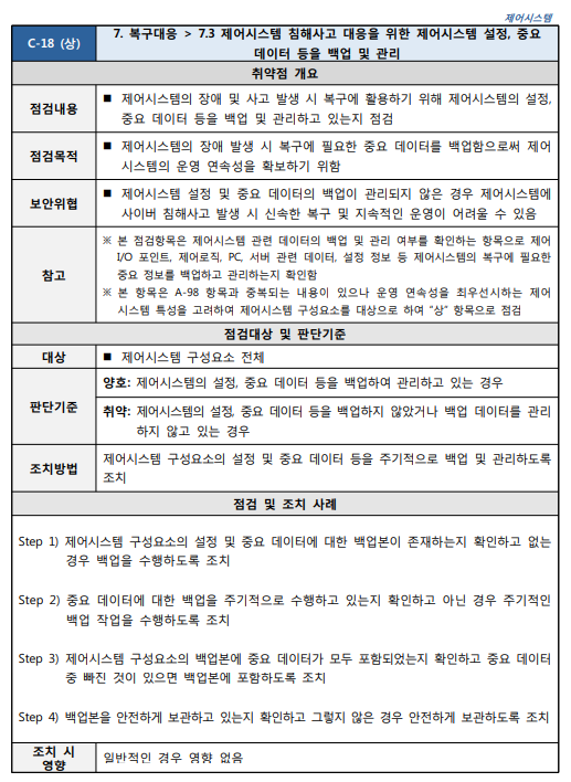 7.3 제어시스템 침해사고 대응을 위한 제어시스템 설정, 중요 데이터 등을 백업 및 관리