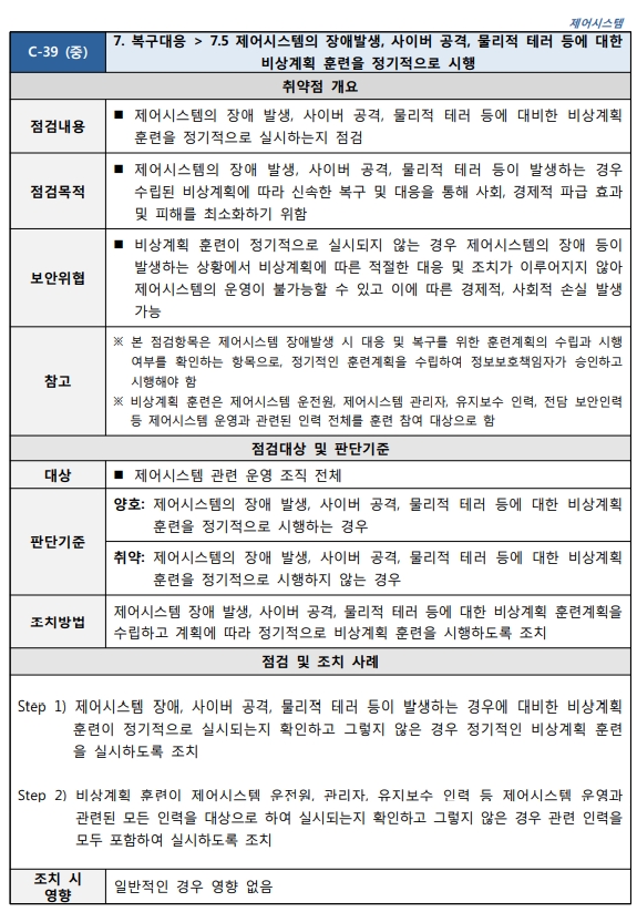 7.5 제어시스템의 장애발생, 사이버 공격, 물리적 테러 등에 대한 비상계획 훈련을 정기적으로 시행