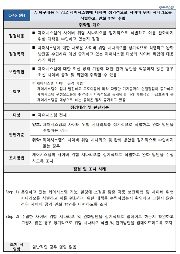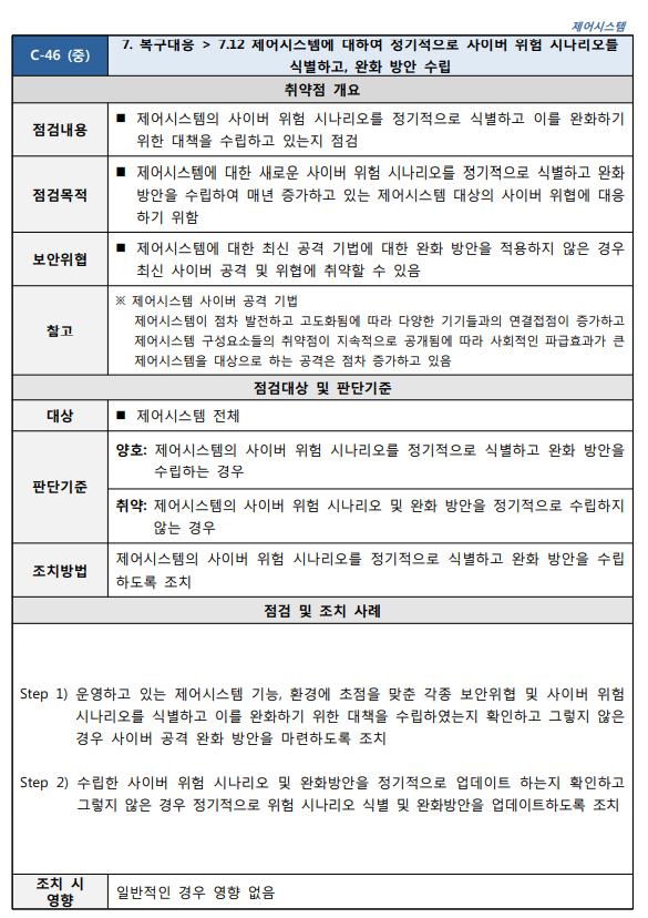 7.12 제어시스템에 대하여 정기적으로 사이버 위험 시나리오를 식별하고, 완화 방안 수립