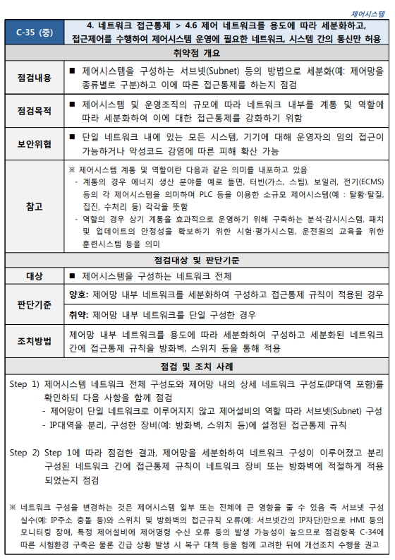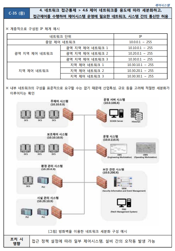 4.7 제어 네트워크를 용도에 따른 세분화하고, 접근제어를 수행하여 제어시스템 운영에 필요한 네트워크, 시스템 간의 통신만 허용