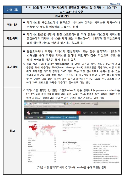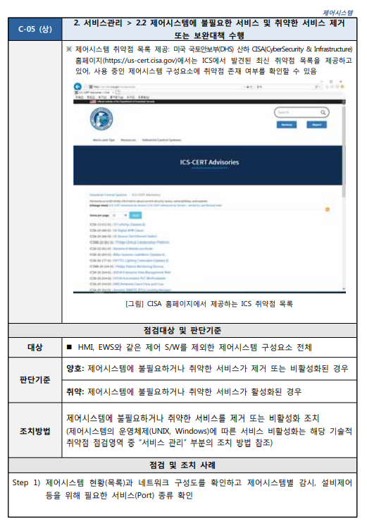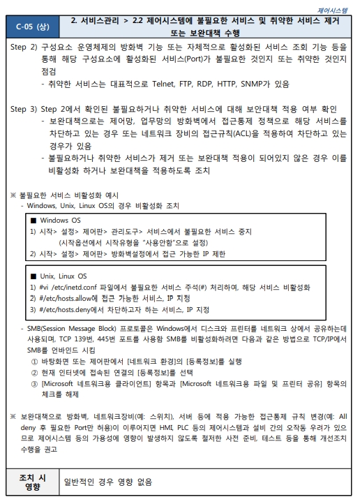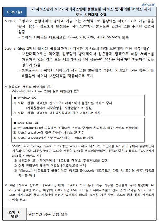 2.2 제어시스템에 불필요한 서비스 및 취약한 서비스 제거 또는 보안대책 수행