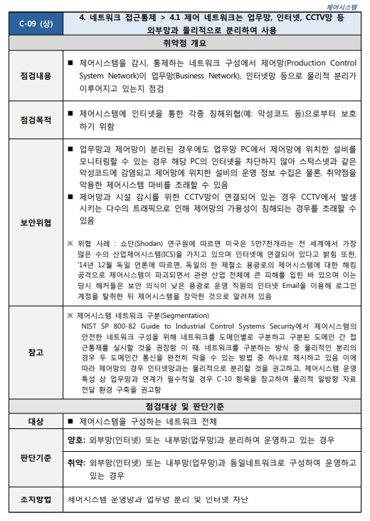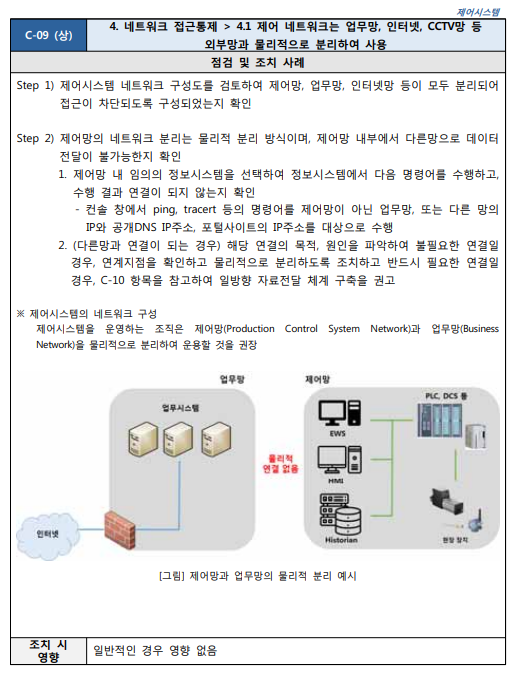 4.1 제어 네트워크는 업무망, 인터넷, CCTV망 등 외부망과 물리적으로 분리하여 사용