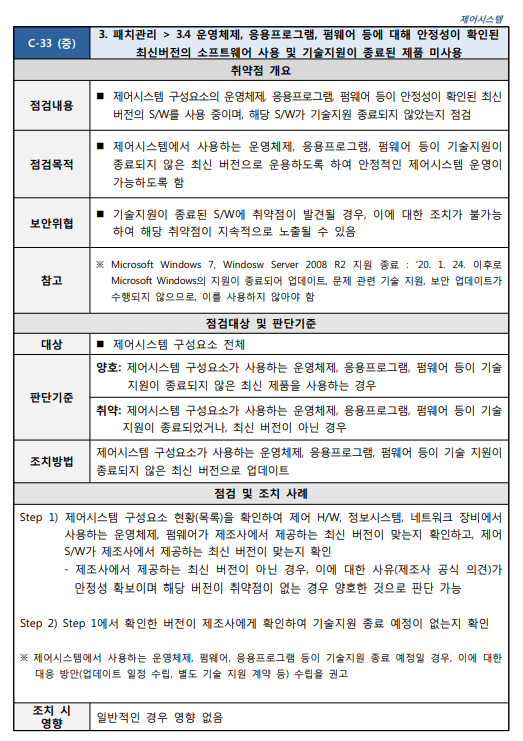 3.4 운영체제, 응용프로그램, 펌웨어 등에 대해 안정성을 확인된 최신버전의 소프트웨어 사용 및 기술지원이 종료된 제품 미사용