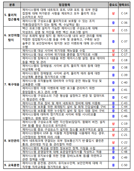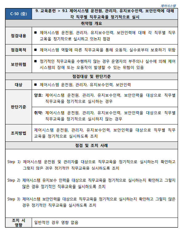 9.1 제어시스템 운전원, 관리자, 유지보수인력, 보안인력에 대해 각 직무별 직무교육을 정기적으로 실시