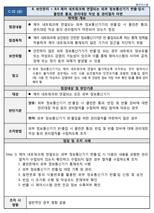 8.4 제어 네트워크에 연결되는 외부 정보통신기기 반출입시 클린존 통과, 관리대장 작성 등 관리절차 마련