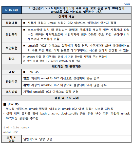2.6 데이터베이스의 주요 파일 보호 등을 위해 DB계정의 umask 를 022 이상으로 설정하여 사용