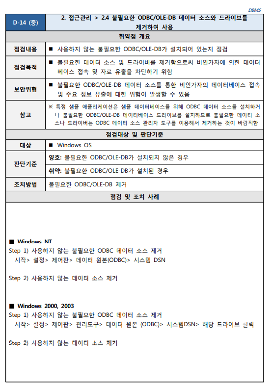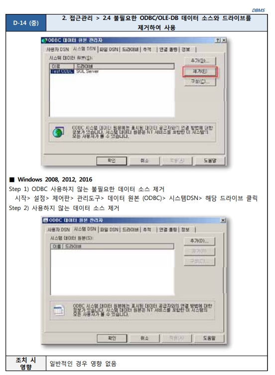 2.4 불필요한 ODBC/OLE-DB 데이터 소스와 드라이브를 제거하여 사용