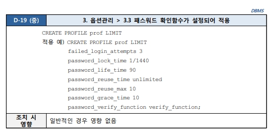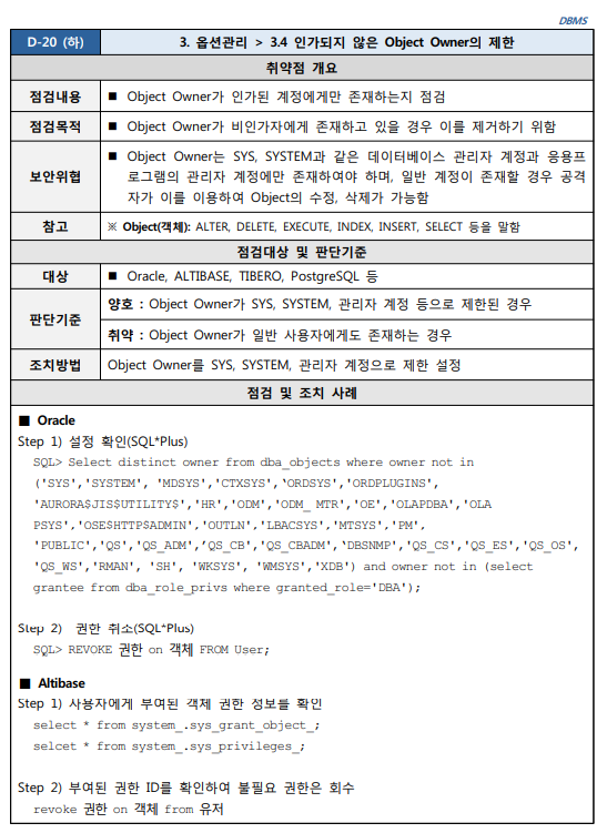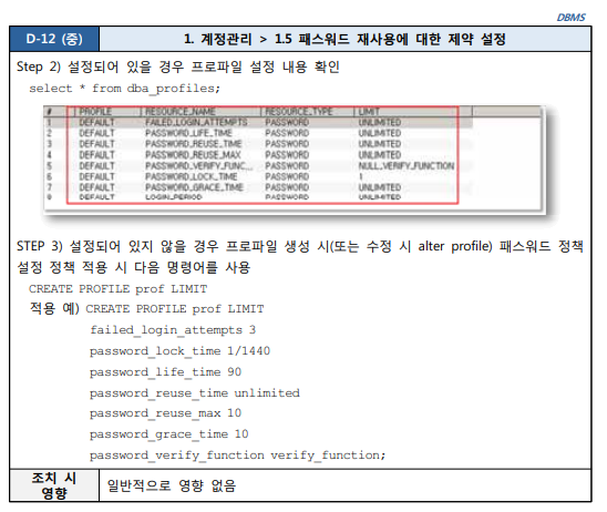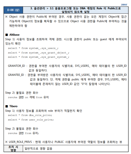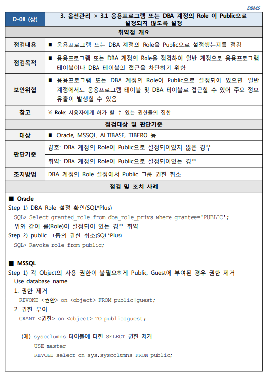 3.1 응용프로그램 또는 DBA 계정의 Role 이 Public 으로 설정되지 않도록 설정