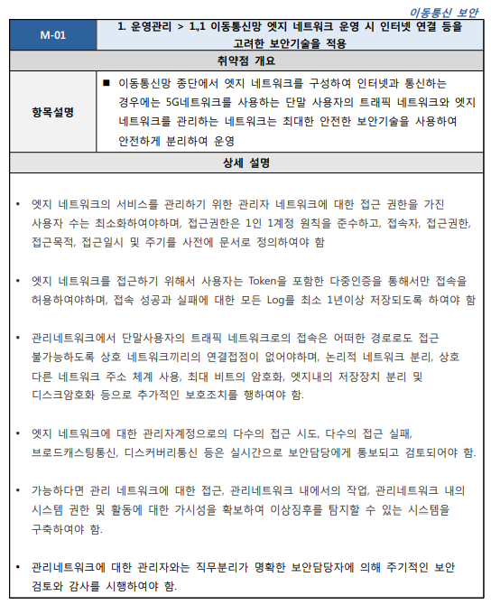 1.1 이동통신망 엣지 네트워크 운영 시 인터넷 연결 등을 고려한 보안기술을 적용