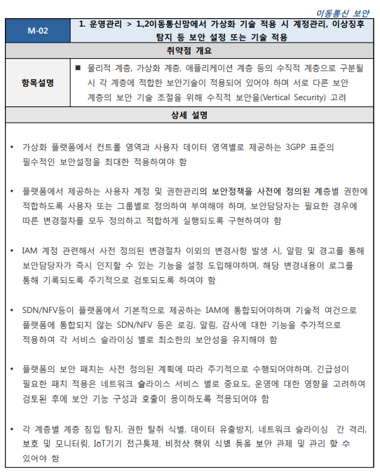 1.2 이동통신망에서 가상화 기술 적용 시 계정관리, 이상징후 탐지 등 보안 설정 또는 기술 적용