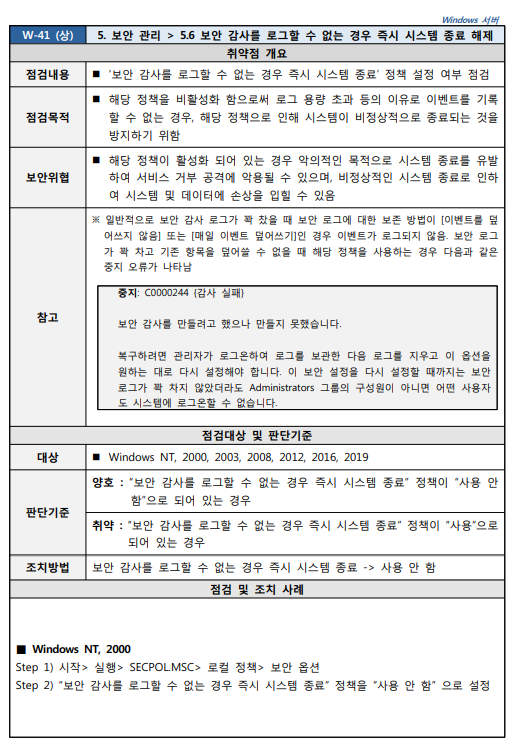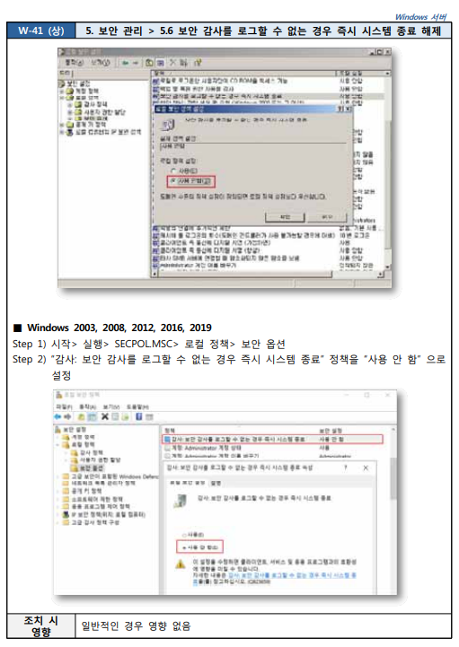 5.5 보안 감사를 로그할 수 없는 경우 즉시 시스템 종료 해제